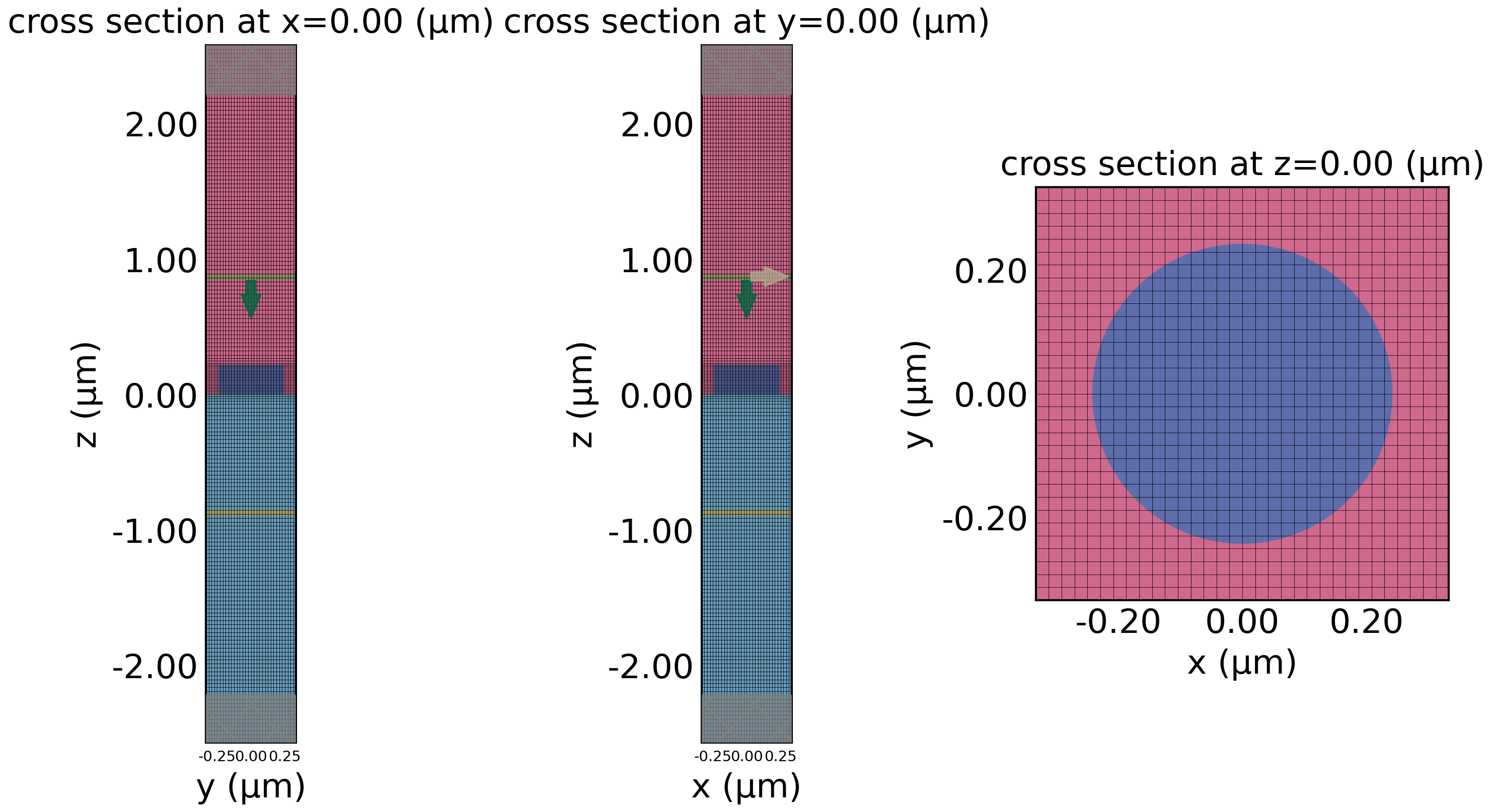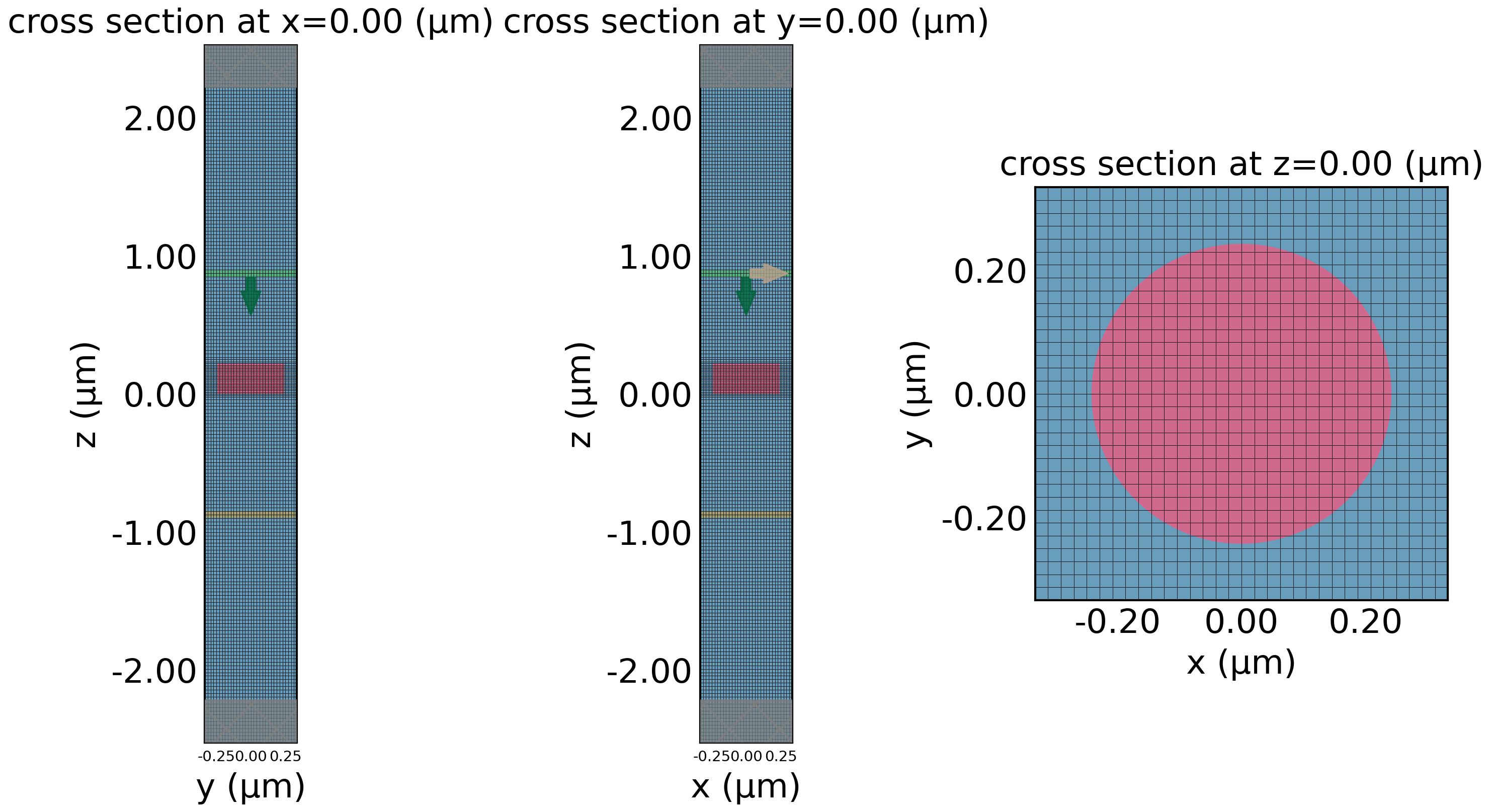 Grid resolution is uniform grid in the horizontal direction with a yee cell length of \frac{P}{32} where P is the periodicity. In the vertical direction, AutoGrid means it’s non-uniform and adjusted based on the wavelength of the particular medium. Here, min_steps_per_wvl=32 means we are taking a minimum of 32 steps based on the wavelength, which will be shorter in the medium with a higher index of refraction.