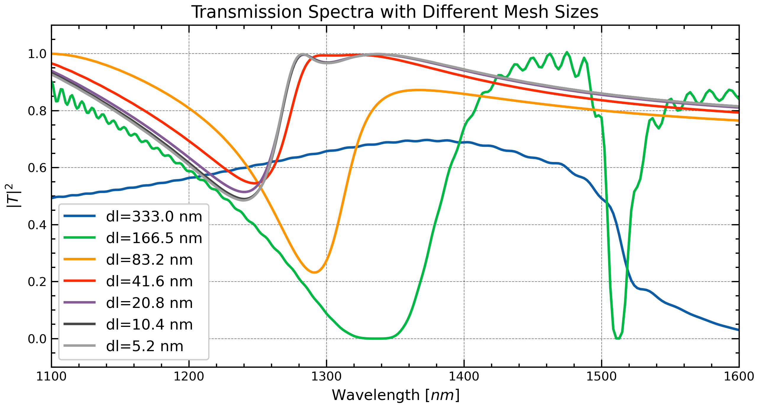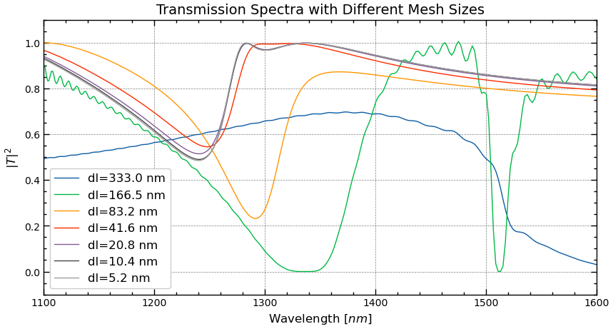 plt.title("Transmission Spectra with Different Mesh Sizes", fontsize=14)